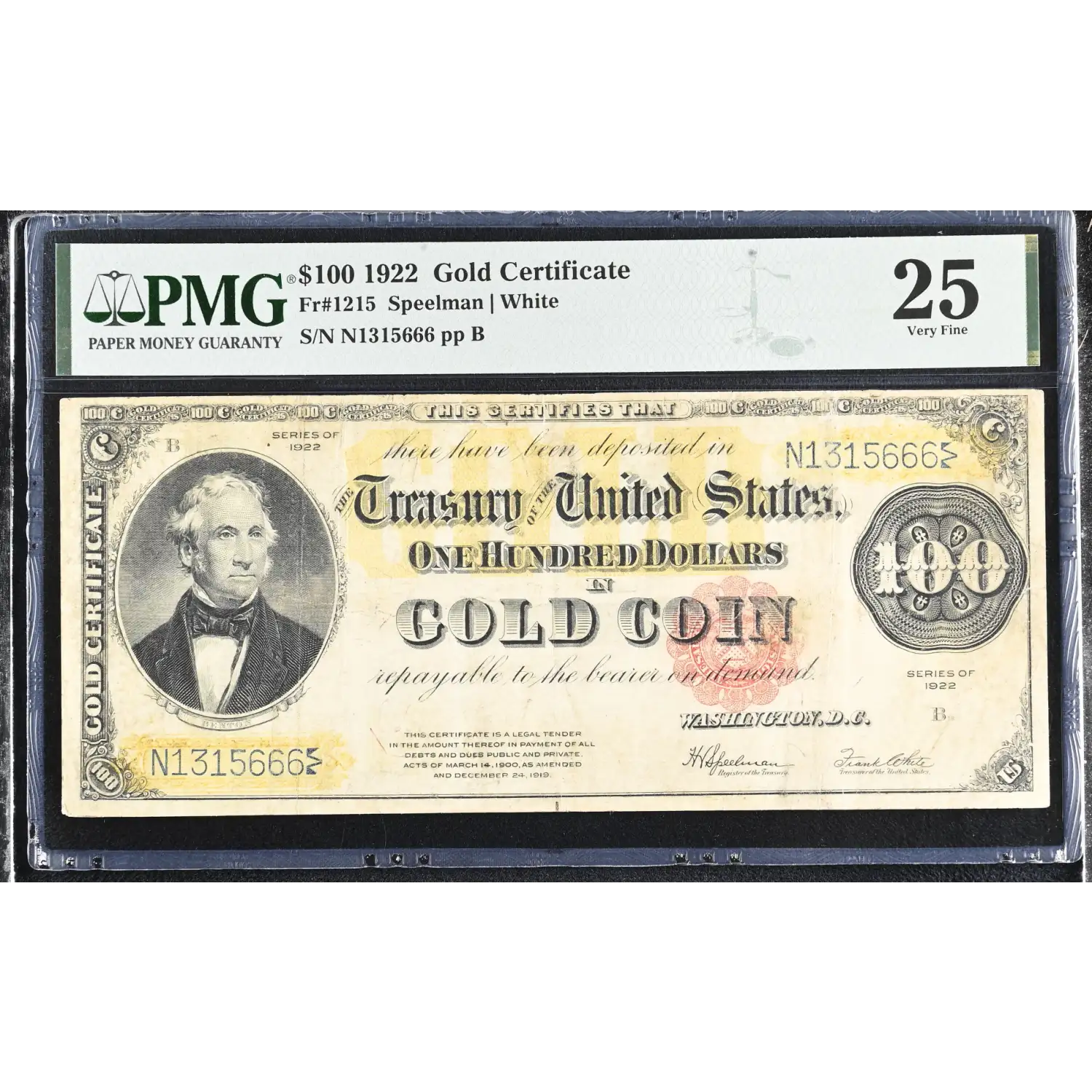 $100 1922 Gold Certificate Speelman White Very Fine 25 PMG