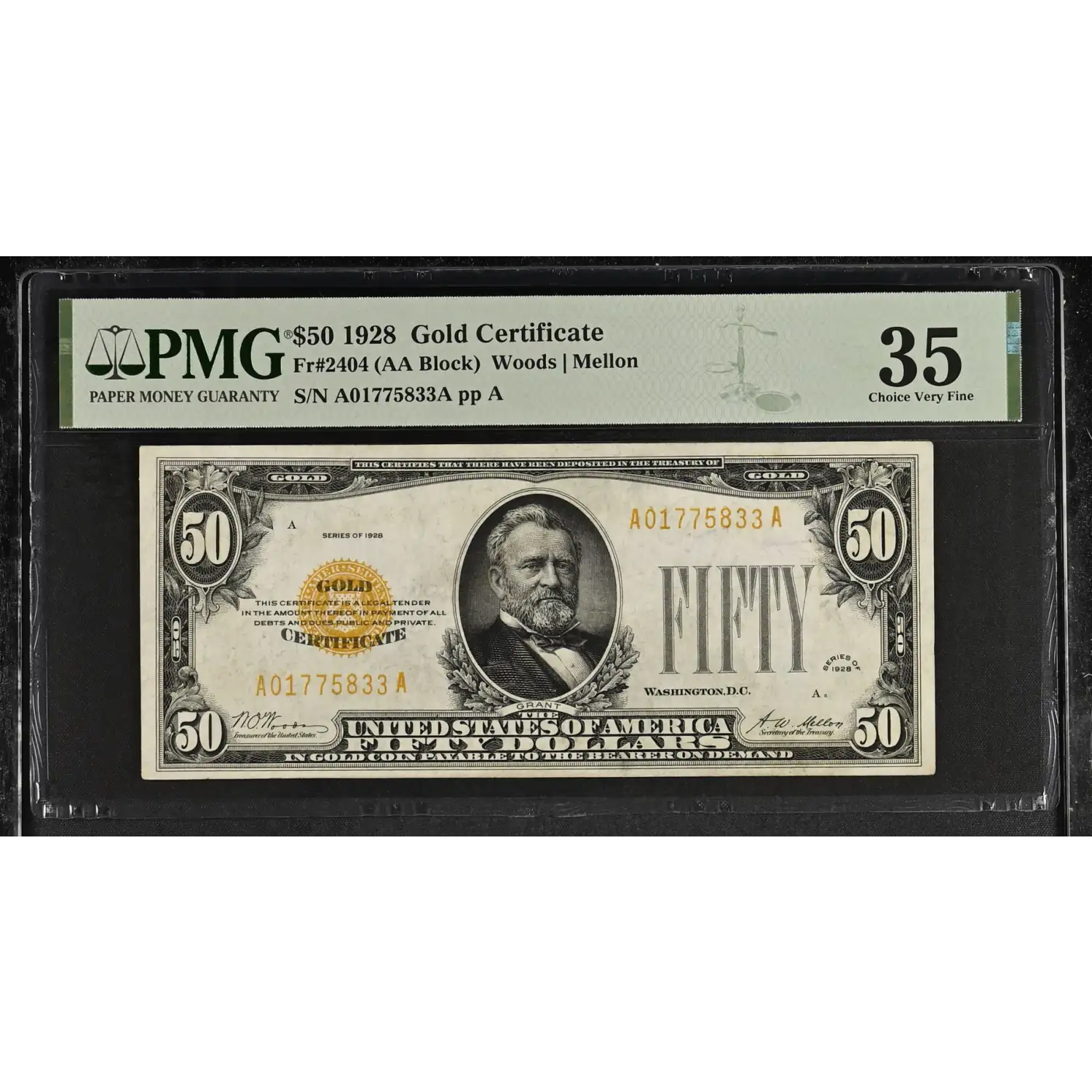 $50 1928 Gold Certificate Woods Mellon Choice Very Fine 35 PMG PQ+